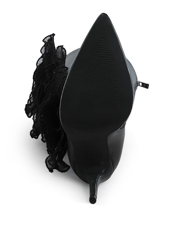 The long boots have an avant garde flair with the gorgeous accentuating sheer roses detail on the boots which exude a romantic charm. The boots are a statement piece and would definitely drop some jaws with their eccentric yet alluring visual appeal. Pair them with a cute mini dress or some short skirts for a ravishing ensemble.