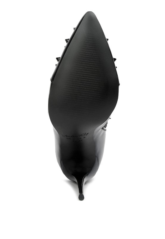 These hologram high-low calf boots will complement any outfit. They have a pointed toe and gold studded accents on the front with a stiletto heel, giving it an elegant look that will make you stand out in a crowd. The soft padded innersole is comfortable, and the side zip fastening makes them easy to wear.